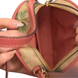This elegant Coach bag features a beautiful floral design in pink and beige. Perfect for adding a touch of sophistication to any outfit.
