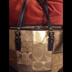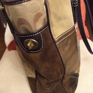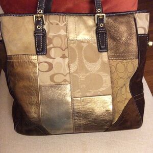 Coach limited edition patchwork collection tote with various patterns, suede and leather, side snap turn pockets, top zipper closure, interior zipper pocket and cell phone pockets. Leather adjustable shoulder straps.