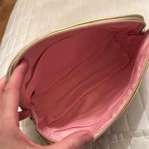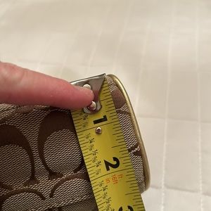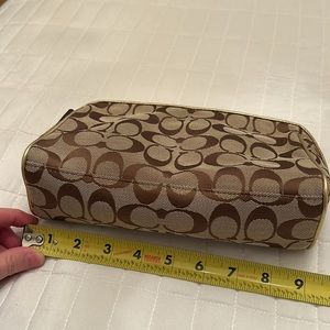 Coach make up bag. NWOT. Tan canvas, gold tag with gold piping. Interior is pink. Super cute! Bin 15