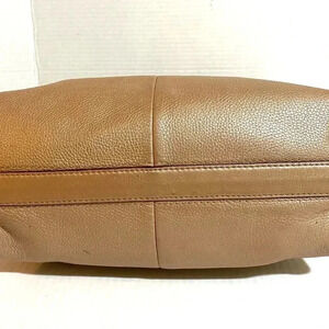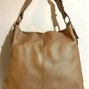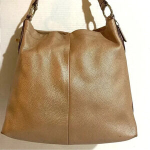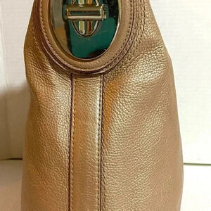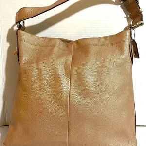 Coach metallic pink cream leather hobo handbag with silver tone hardware main compartment 3 pockets at interior wall 1 zip closure & snap closure at top fabric lining lining have some stains exterior some marks hight 14” width 14” depth 5” strap drop 10”