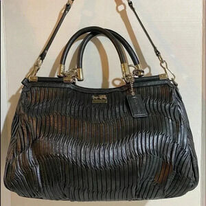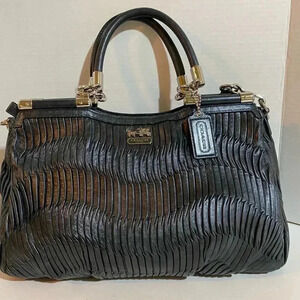 Authentic coach metallic grey/ blue leather satchel handbag with silver tone hardware main compartment 3 pockets at interior wall 1 zip closure & zip closure at top satin fabric lining logo at front & hardware hangtag at side back have some creasing hight 11” width 13” depth 4” strap drop 7.75” shoulder strap 12” Bag dimensions are based on approximate measurements before placing an order please take a moment to view all photos using feature for a closer look