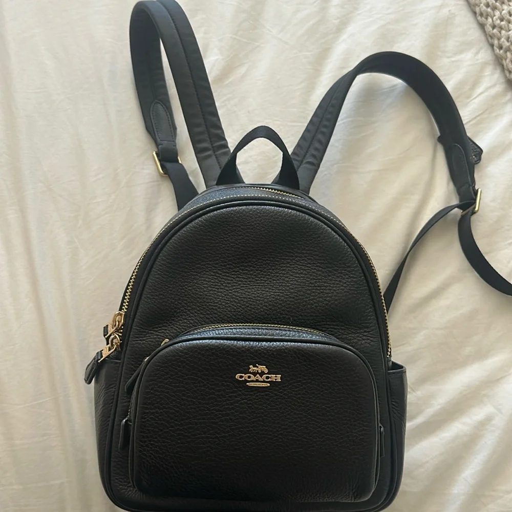 Black- gold hardware Coach mini backpack. Thick soft adjustable straps. Two large zipper pockets, inside zipper and cardholder pocket. Front small pocket & two small side pockets