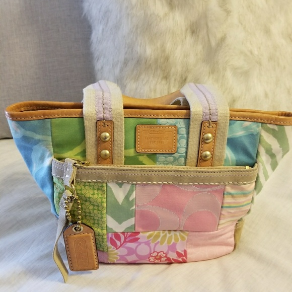 Very cute mini patchwork purse from Coach. The item is authentic and in very good condition. It measures 11 inches across and is 7 inches high.