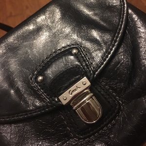 Black leather, some wear to it. Coach tag, and I don't have the dust bag. One marking on the inside that is displayed in pictures. Very cute purse, can be used inside a bigger purse as coin purse/wristlet.
