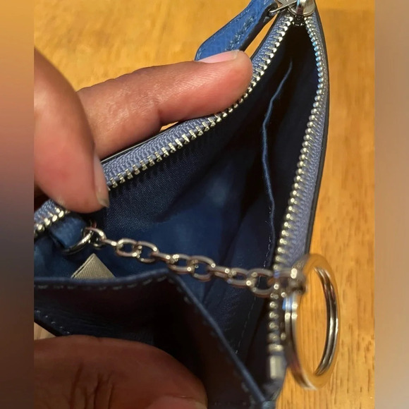 Coach mini skinny ID case, new in the box. This wallet has a zipper closure and a keychain attachment.