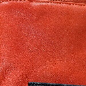 Gorgeous colors on this color block, orange/tan/navy "Carrie" leather Coach bag. Comes with hang tag plus brown leather loops with the tag. Front of the bag has a navy pocket with twist lock. Brown leather side pockets wrap around the bag. Back of the bag is orange. The bag appears to have not been stored properly, causing the leather to wrinkle on the bottom. There are also some scratches on the front left top corner of the bag. The leather has some other areas that are not smooth, but this is not a structured bag and is meant to have some slouching over time. Check the photos or come to one of my live shows and ask me to show you the whole bag :))
