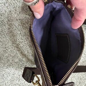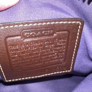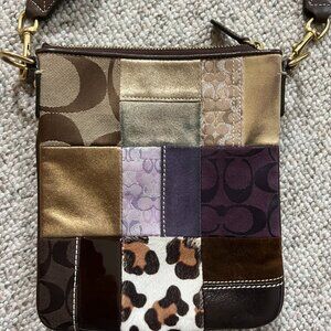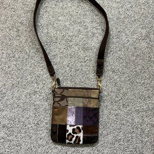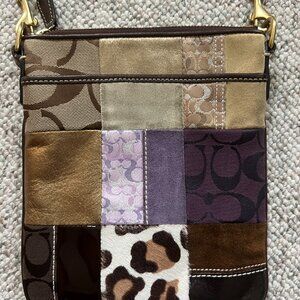 Genuine Coach patchwork adjustable crossbody purse gently used. multi color patchwork exterior, purple lined inside.