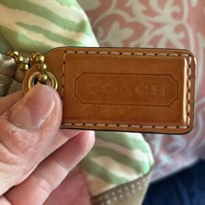 Coach patchwork bag, pinks, greens and blues, tan bottom, lavender inner lining. Has staining, needs a good cleaning.