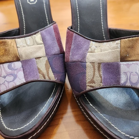 Coach patchwork clogs. Slightly used. One mark on gold patchwork right shoe, see picture. Size 8 with 4" heal. Great condition.