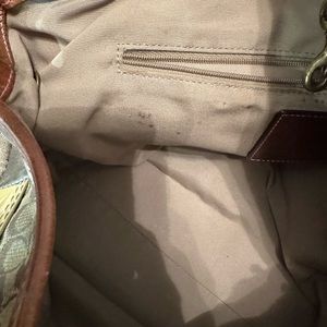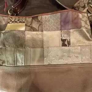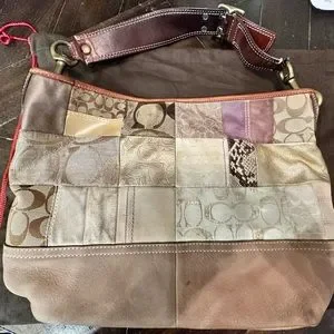 Large style patchwork design heavy on purples and creams. Light leather detail on bottom. Purchased from coach store directly in California. Kept in original bag while not using. A few minor wear and tears shown in pictures. Not using anymore and ready for a new owner!