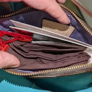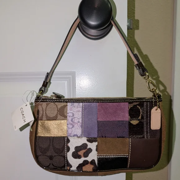 Coach small multicolor (purple, brown, beige and gold) patchwork purse NWT, never used, comes with dustbag and paperwork. Estate sale.