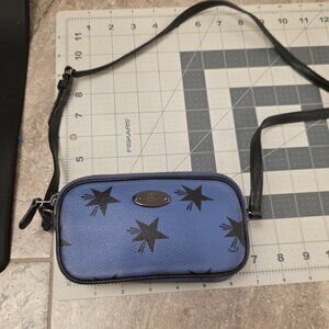 The Coach Zipper Mini Bag in blue is a stylish crossbody bag featuring stars, a zip closure, and an adjustable strap for comfort. Made of coated canvas with leather accents, this mini bag is perfect for women looking for a chic and trendy accessory. The bag also includes additional features and is part of the Coach product line, making it a reliable and fashionable choice for any outfit.