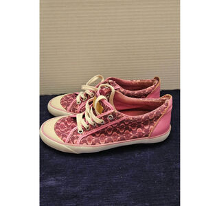These sneakers are in excellent shape over all, but do show small signs of wear on sole and around opening. These are all pink, with pink leather accents. Style is Barrett II
