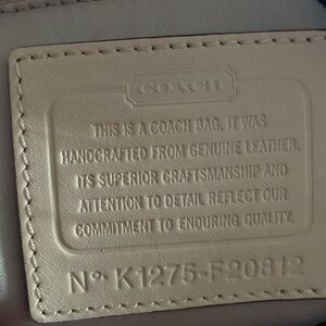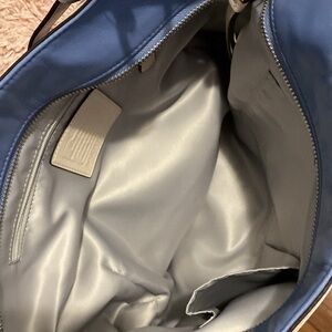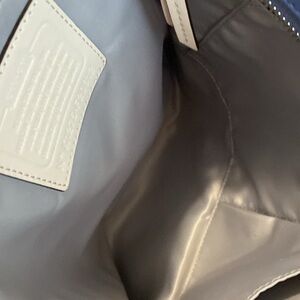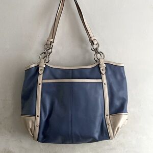 Coach handbag leather colors blue & white, it’s flawless 1 long zipper pocket across 2 compartments on ORT her side for cell phone. Preloved in excellent condition.