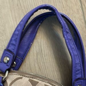 Perfect Tan with pops of purple coach shoulder bag, this bag is the cutest! Bag does not come with strap to be used as crossbody. Other than that bag is in great condition