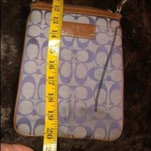 Coach purple canvas monogramed crossbody brown cognac leather trim 9”
