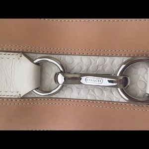Cream Coach purse with leather detail and strap. Minor wear on bag but overall in good condition.