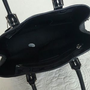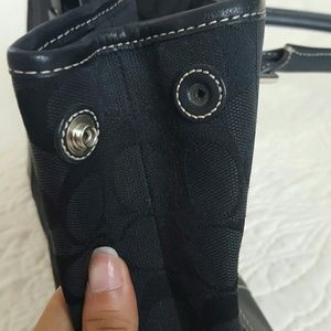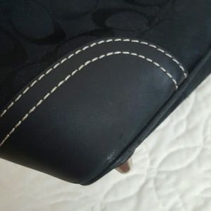 Small black Coach purse. The handle is short, does have some minor scratches & discoloration on the bottom corners from being worn out & missing clamp (on pic)