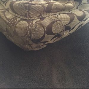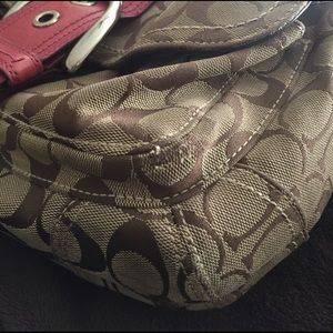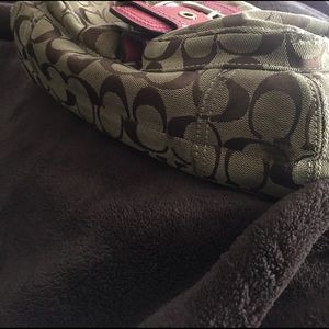 Real Coach purse. Used but in good shape. Slightly worn on a couple of small spots towards the bottom. Not very noticeable (see pictures). Pink buckle, strap and tag. Silver accents on buckle and strap. Purse itself it brown. Cute and stylish purse!