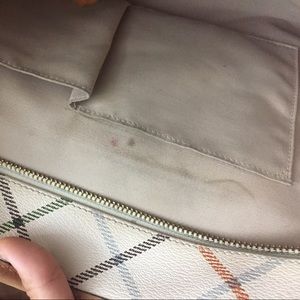 Purse has some flaws! There's some discoloring on some parts of the straps, some stains inside the purse, and some coloring on the back of the purse due to jean rubbing. However, none of these flaws are highly noticeable!! You can tell by just looking at the inside, it looks perfectly normal, unless you look in the side pockets! Strap discoloring and the coloring on the back of the purse is barely noticeable.