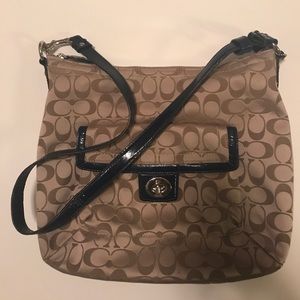 Convertible strap coach purse. Tan with navy patent leather trim and strap. Very gently used.