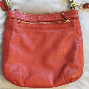 Orange purse with removable crossbody strap. Zipper pocket on back. Zipper pocket and two open pockets inside.
