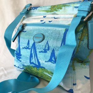 Easy, breezy fabric and leather Coach bag with cute sailboat pattern. NWT, never used! Approx. measurement 10"W x 9"H x flat