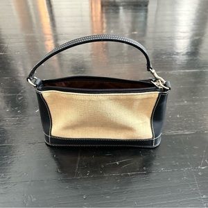 Small purse from Coach. Canvas with leather detail. Leather trim is navy blue. 9.5 inches x 5 inches.