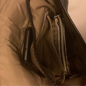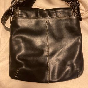 Coach purse black leather with buckle. Pics with cell and cosmetics bag are to show the different sections and are not included! Nice coach purse with two separate compartments as well as a slip pocket. The other side (inside) has two pockets that don’t zip. Very light wear with some mild wear on corners. It is not noticeable but worth mentioning also reflected in price! Euc!