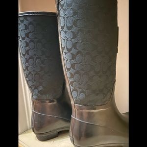 lightweight, rain-resistant canvas-and-rubber boots update the classic Wellie with luxurious Coach leather trim and a graphic signature plaque. Size 5