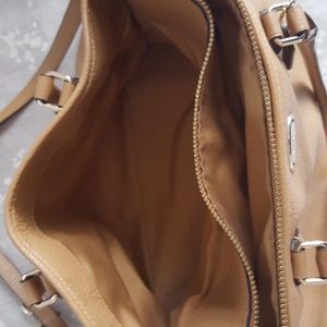 Natural leather satchel, exterior free of markings, only imperfection on interior is discoloring of fabric lining by the zipper (shown in pictures), zip closure for main compartment, two open compartments as well, one in front with logo, and full size compartment along the back, in great condition