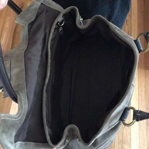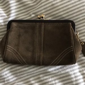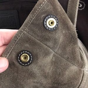 Moss (greenish/brown) colored Suede COACH satchel shoulder bag! Brass hardware.... snap closure.... inside zip pocket plus two accessory pockets.