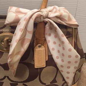 Medium sized Coach shoulder bag, tan leather, brown print, detachable silk bow with C print, small small stains on the outside