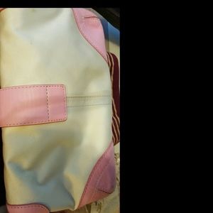 Leather pink trim on off white. Like new, rarely used. Little sign of wear. Clean non smoking home.