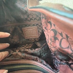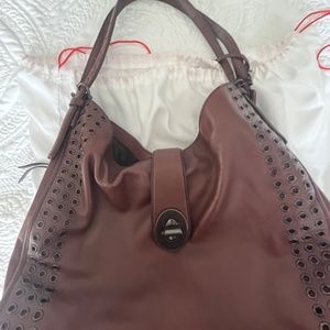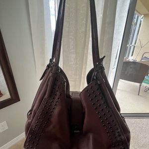Beautiful like new shoulder bag. Hardly used. The color is burgundy and has a front clasp and studding on the sides. This bag holds all your stuff and includes a middle divider with extra pocket. Size is 15”Lx12”Hx6”W