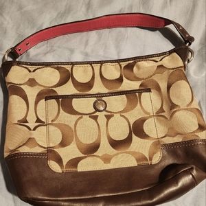 It's my favorite Coach bag. Signature print with pink lining and pink shoulder strap. One small front pocket. Large inside main section.