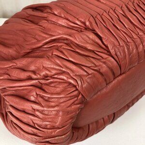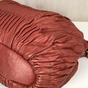 The bag in the image is a Coach Madison Gathered Sophia Satchel. Its measurements are approximately 9 inches in height, 12 inches in width, and 4 to 5 inches in depth.