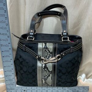 Coach shoulder bag. Gray base with black signature print. Stripe detailing of snake skin print. 2 tone leather trim. Silver hardware and clip detail. Zipper closure.