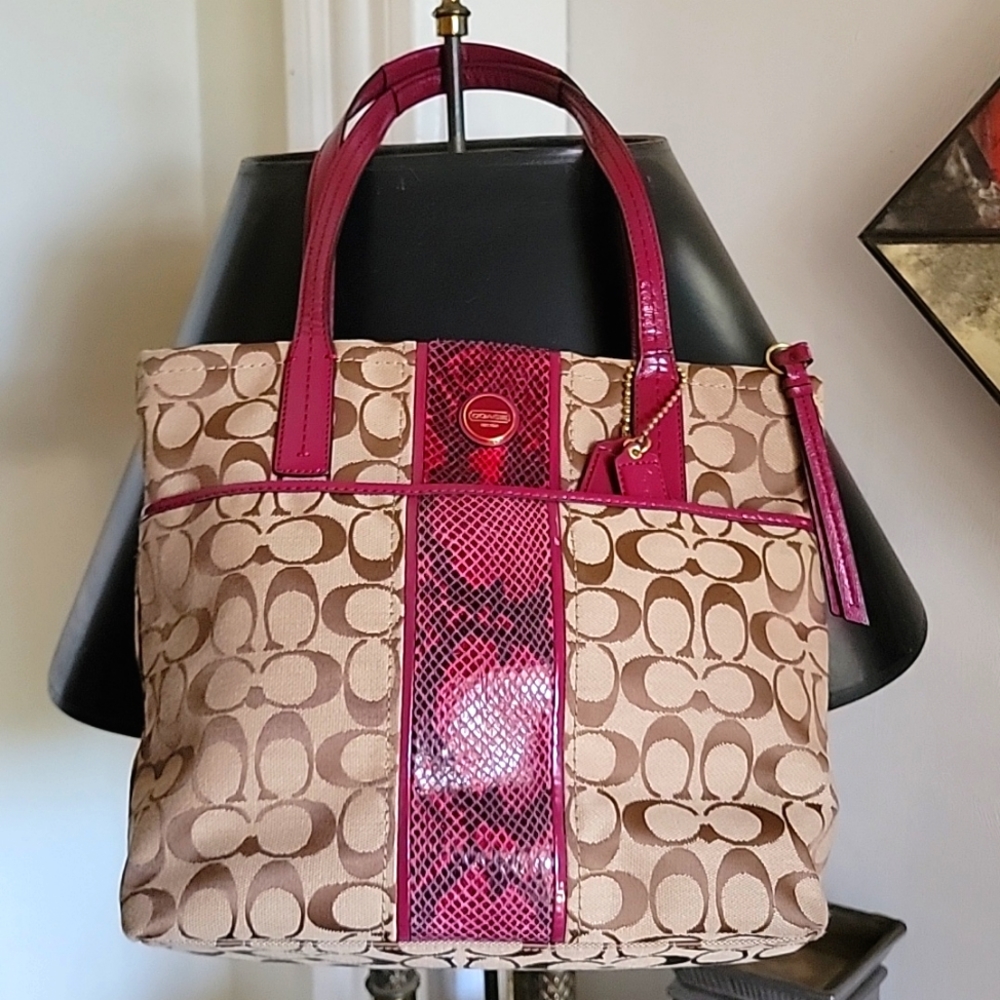 Coach Signature Python Stripe Tote Handbag Raspberry