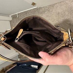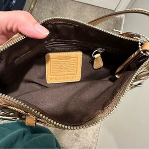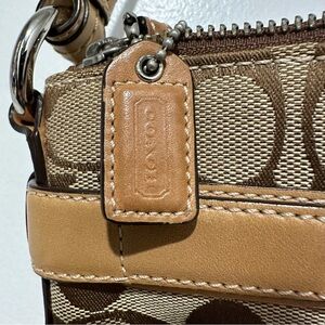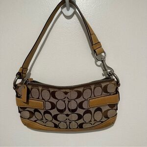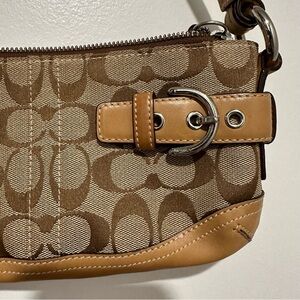 Vintage coach, signature, C bag with leather handle and trim. In excellent preowned condition.