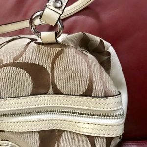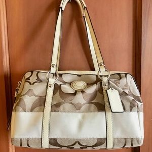 "Coach" signature canvas and patent leather (trim) handbag. Ivory and brown canvas, ivory patent leather trim (straps, too). Detachable, adjustable shoulder strap to use besides shorter handles. Silver hardware. Height= 9", length= 12", width= 6.5". Handle straps= 20" each strap, shoulder strap= 33" (longest). Excellent, used condition. (3rd top photo shows a very light mark). Thanks for looking!