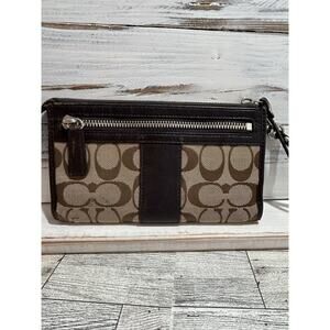 The Coach Signature Canvas Wristlet in Brown is a small rectangular purse with a zip closure and silver hardware accents. It features a black wrist strap handle and a monogram pattern on the brown canvas exterior. This lightweight designer purse is perfect for women looking for a stylish and practical accessory to carry their essentials. Made with coated canvas and leather trim, this Coach wristlet is a versatile piece that combines fashion and functionality.