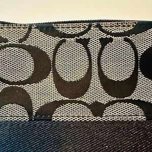 Classic Coach wristlet in tan with brown striping, leather tag logo and strap and silver hardware. Top zip closure. Width 6” x Length 4”.