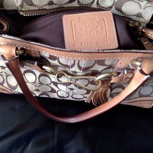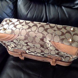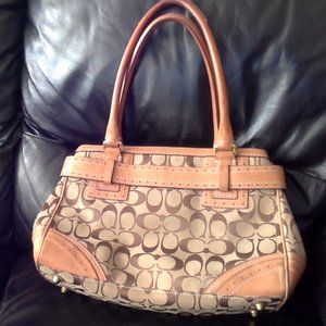 Brown signature jacquard handbag with leather trims. Good condition, no rips or tears. Some stains on leather trim. size, 12 inches by 8 inches by 4.5 inches, approximately. Zippered top, inside has 1 zippered compartment and 2 slip pockets.
