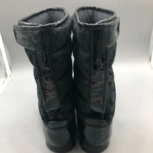 Black waterproof canvas snow boots in the signature CC Coach logo pattern. Patent leather detail at toe and around foot. These do you have a significant amount of wear including to the bottom sole so I have price them accordingly.