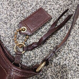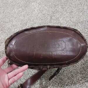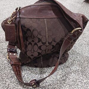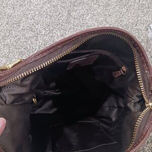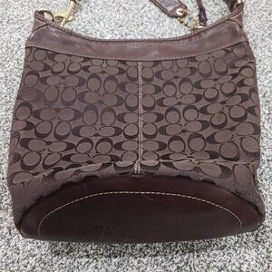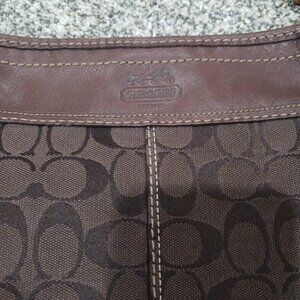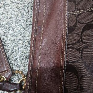 Excellent condition. No damage/wear on fabric. Leather trim shows some scuffs, mainly on bottom and area surrounding top in one particular area mainly. (See photos as they show this scuffing). Some green on backside of rivet of tag. All zippers work. Inside features satin lining in solid brown with one zipper pocket and two slip pockets. Measures 13" high without strap, 15" across top, 10" across bottom, 6" wide at bottom. Strap drop is adjustable from around 13-15" with three grommets and buckle. Gold hardware. Beautiful bag!