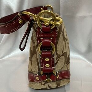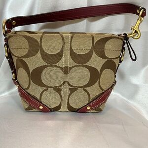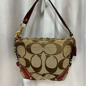 Coach signature print handbag with red leather trim and gold tone. Single leather strap handbag.