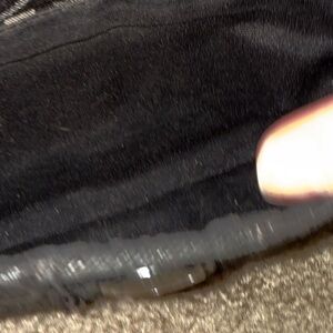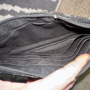 Large wristlet in black with large silver metallic C’s and wide black stripe down the middle with a black button. The hanging iD tag is of Black Patent leather.