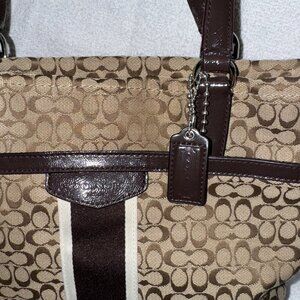 Elevate your style with this elegant Coach signature stripe tote bag in a beautiful brown color. The bag is made of high-quality canvas material with a striped pattern that adds a touch of sophistication to your outfit. The bag is 13 inches wide, 18 inches high, and 10 inches deep, providing ample space for all your essentials.