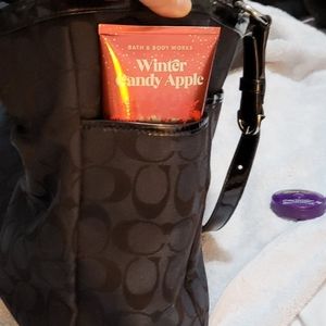 Selling this black Coach tote bag in signature design. It is in mint condition. I bought it many years ago and used it ten times or less. It is just sitting in my closet as I only need a small bag now. The inside and outside are very clean. There are no rips or scuffs on the canvas, but the handle shows some wear, though no rips in the leather. It is still in very good used condition. See the pictures for size; I've included measurements. Measurements are approximately 13L x 10H x 5W inches. It has one main zip closure, two exterior open pockets, one exterior back pocket, one interior zip pocket, and two interior pockets. Perfect for work or school.